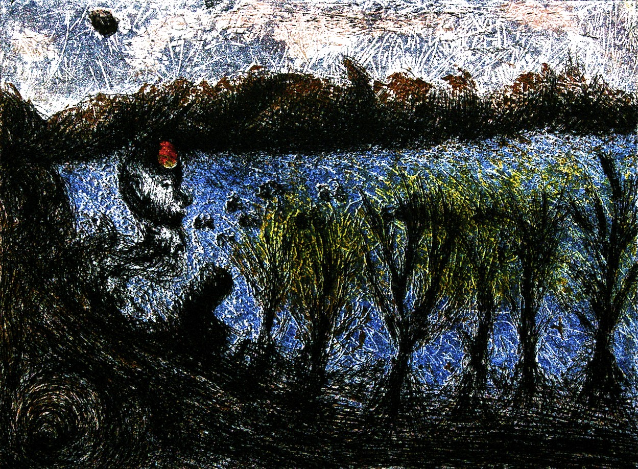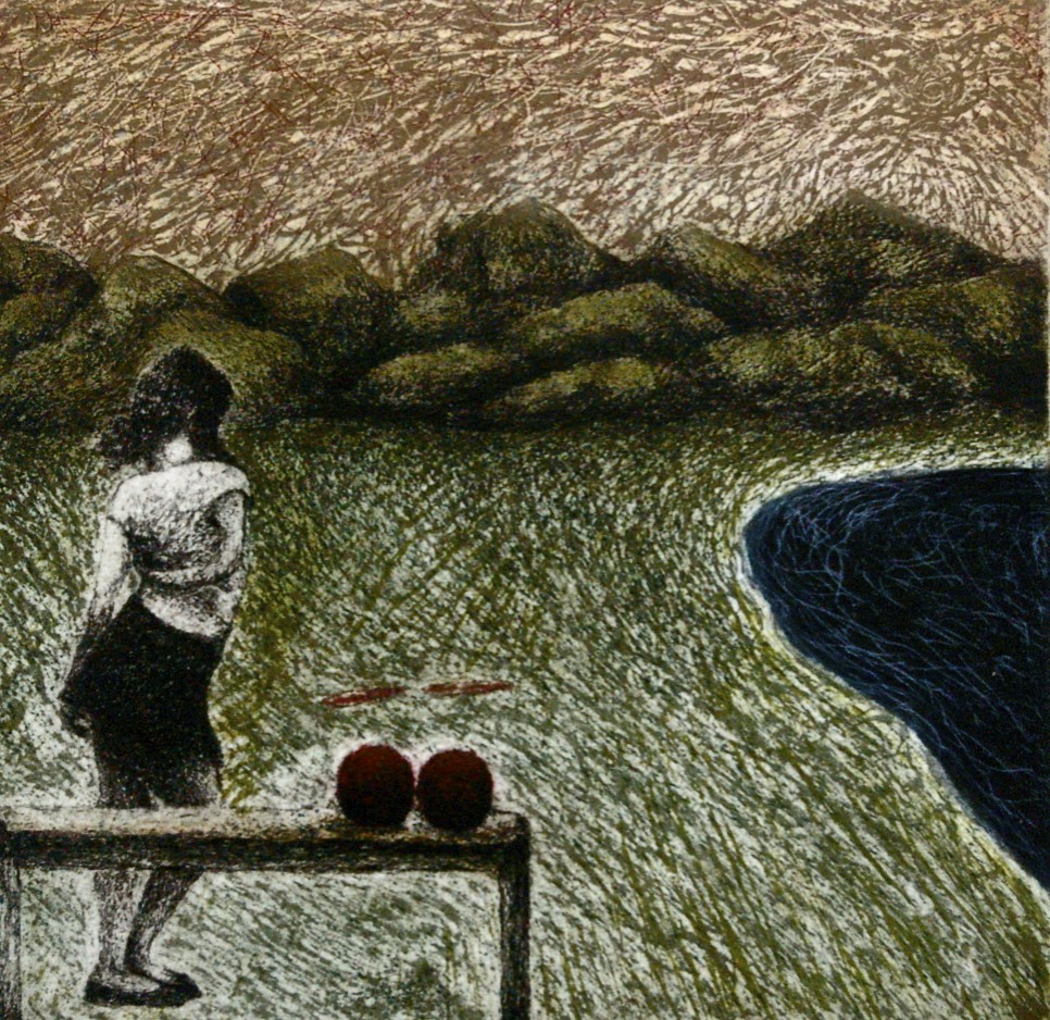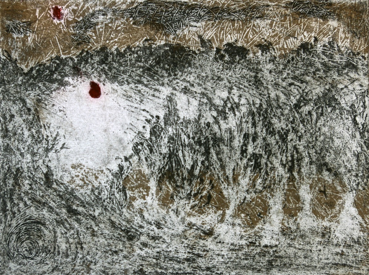 Dreamcomposition 21, Intense Gold, Etching and aquatint, 23 x 25 cm, edition of 40.Touched under influence, aquatint, 15 x 21 cm, edition of 20.Touched, etching and aquatint, 15 x 21 cm, edition of 20.Dreamcomposition 12, mixed media with gold leaf on paper, 56 x 76 cm, (private collection)Man and woman by the sea with ladder, mixed media on paper, 53 x 79 cm.Interpretation for ‘La Vie’, oil and gold leaf on board, 50 x 40 cm