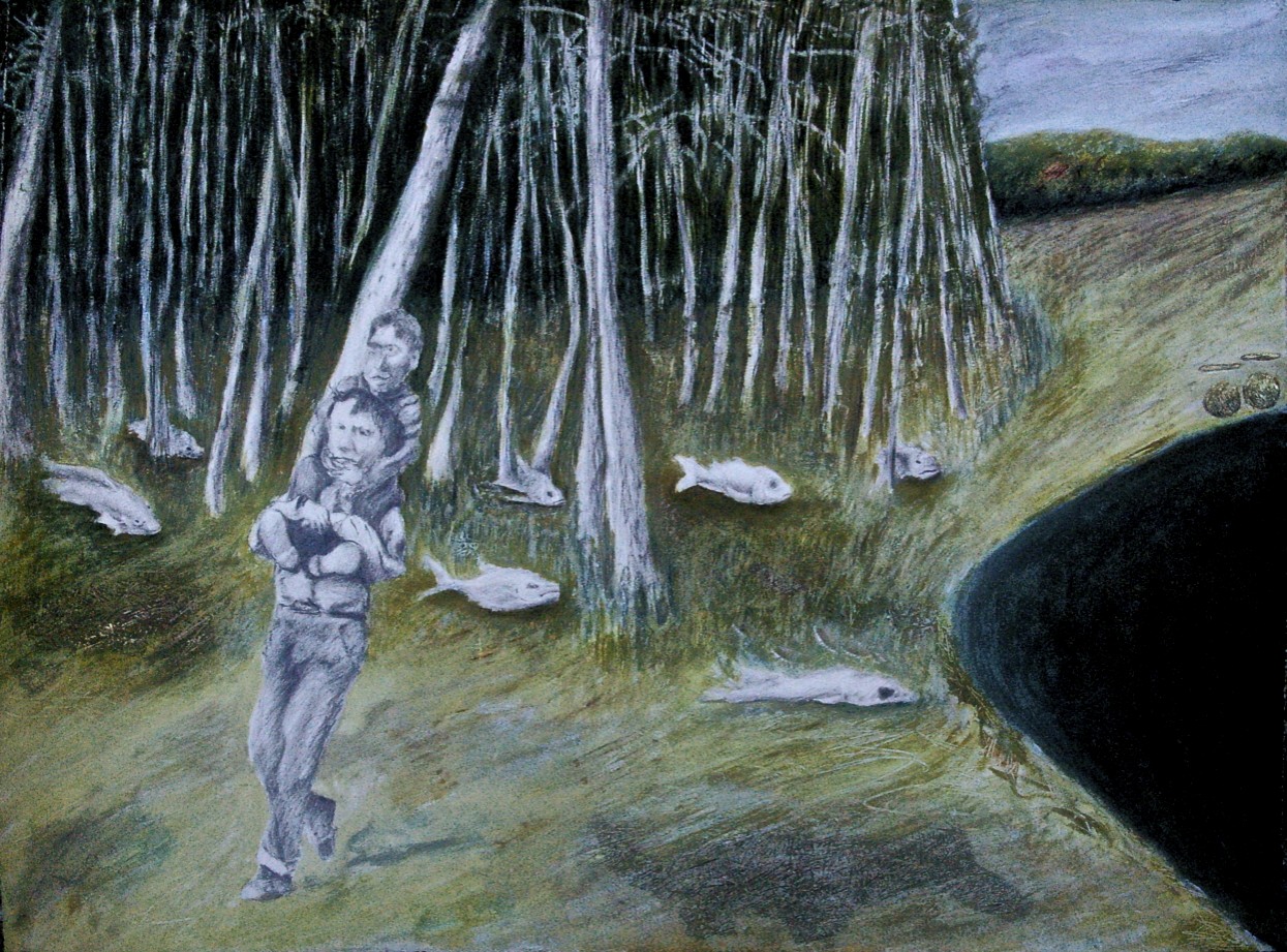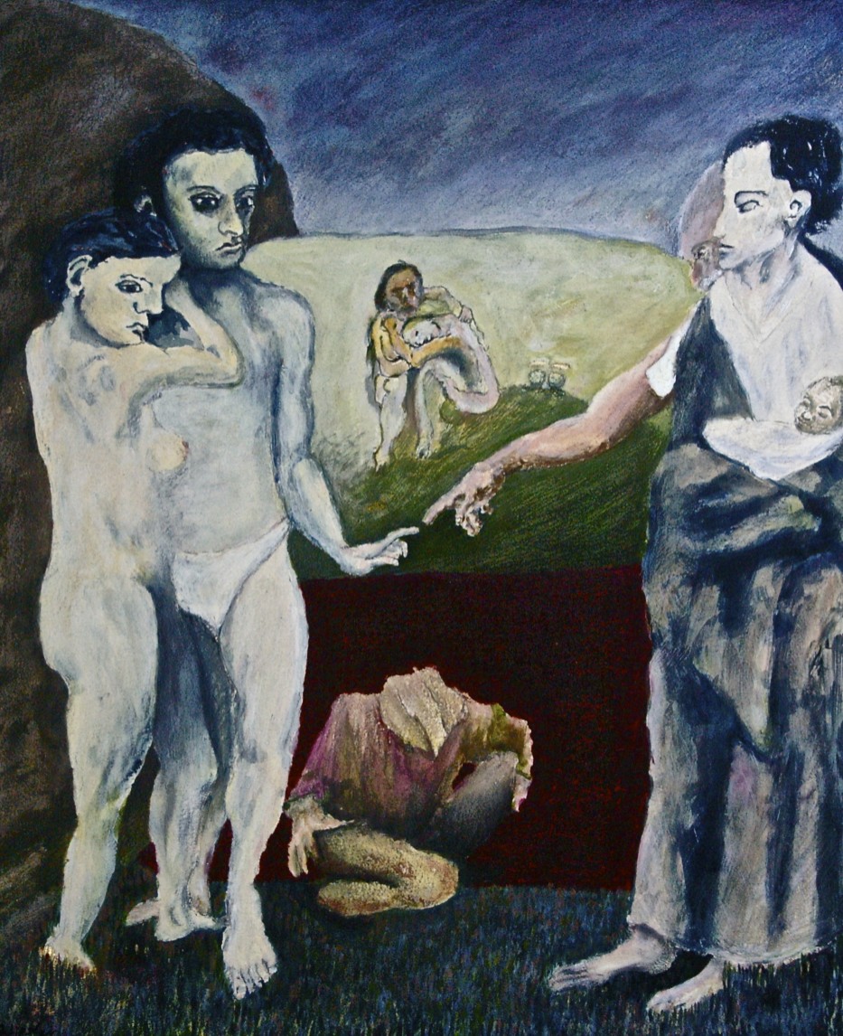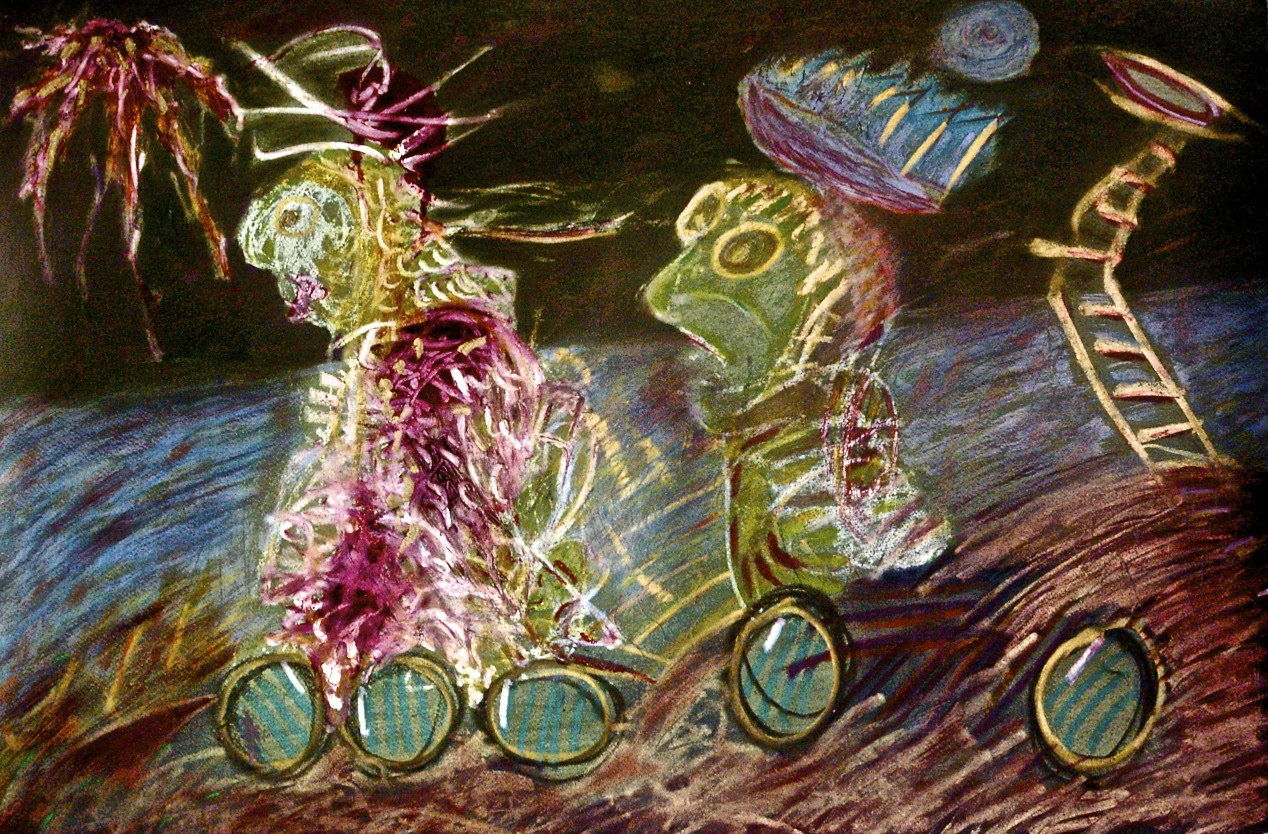 Dreamcomposition 21, Intense Gold, Etching and aquatint, 23 x 25 cm, edition of 40.Touched under influence, aquatint, 15 x 21 cm, edition of 20.Touched, etching and aquatint, 15 x 21 cm, edition of 20.Dreamcomposition 12, mixed media with gold leaf on paper, 56 x 76 cm, (private collection)Man and woman by the sea with ladder, mixed media on paper, 53 x 79 cm.Interpretation for ‘La Vie’, oil and gold leaf on board, 50 x 40 cm