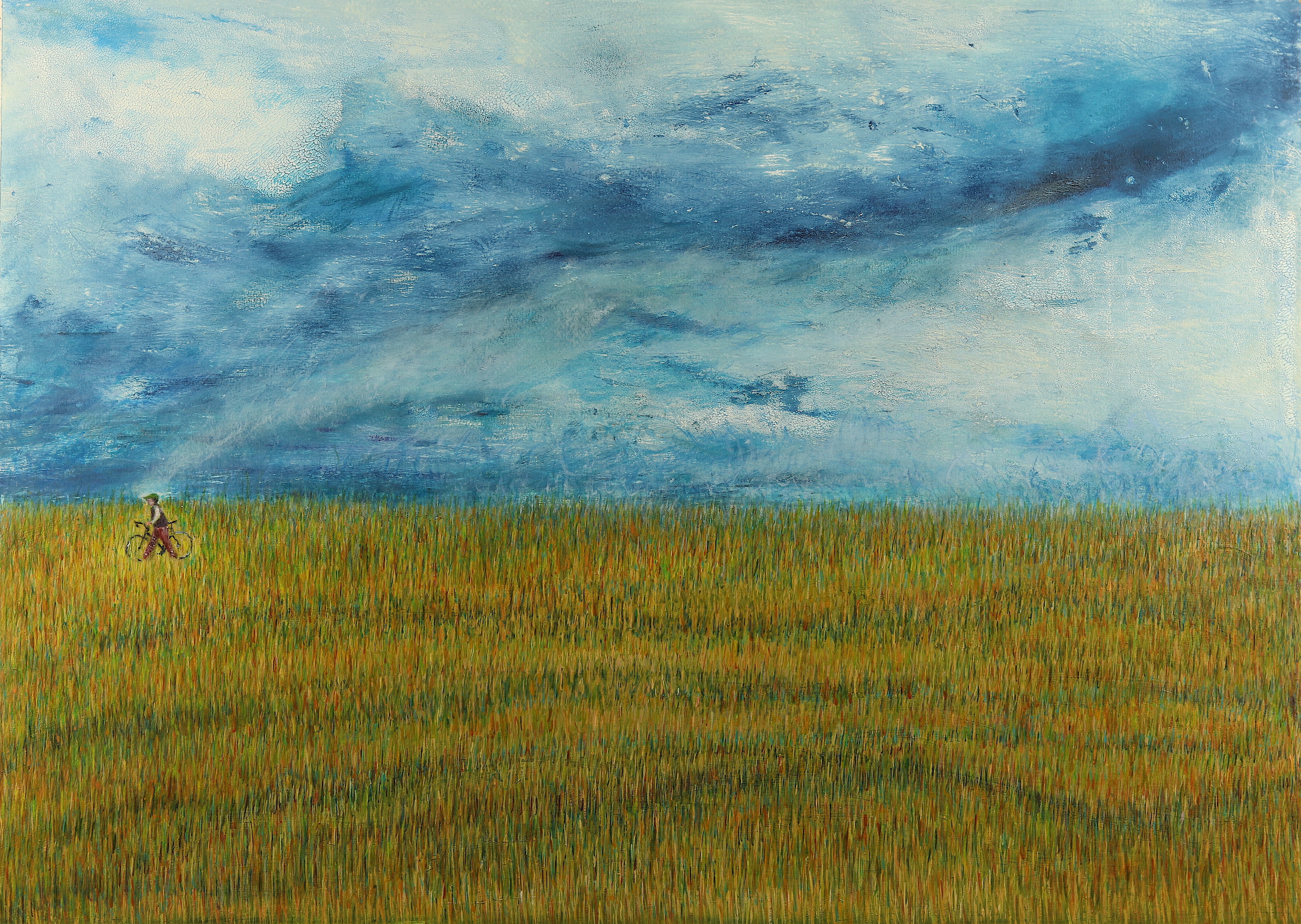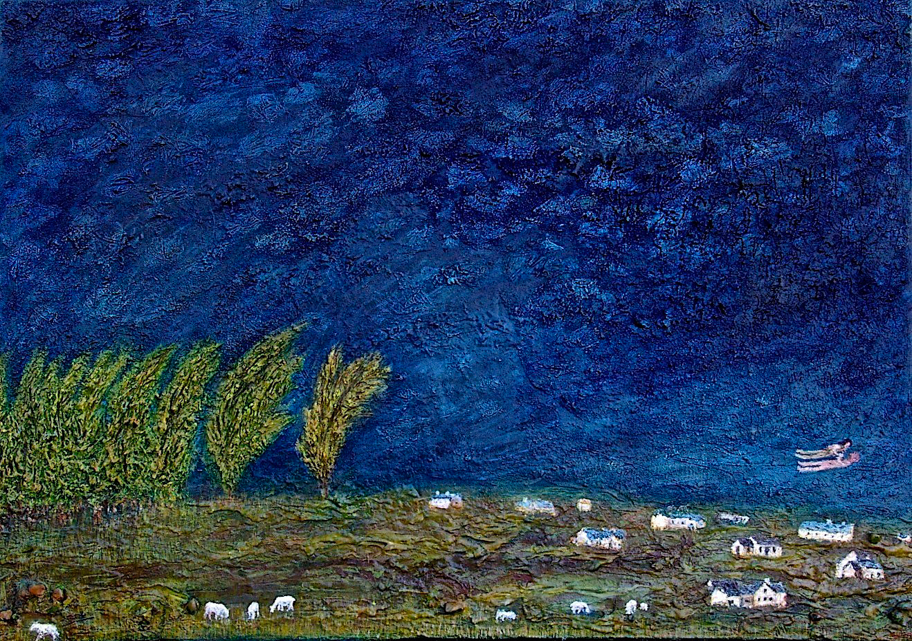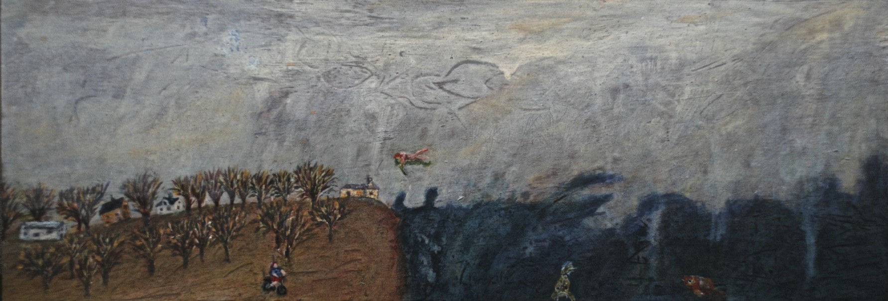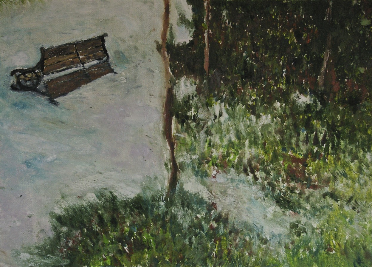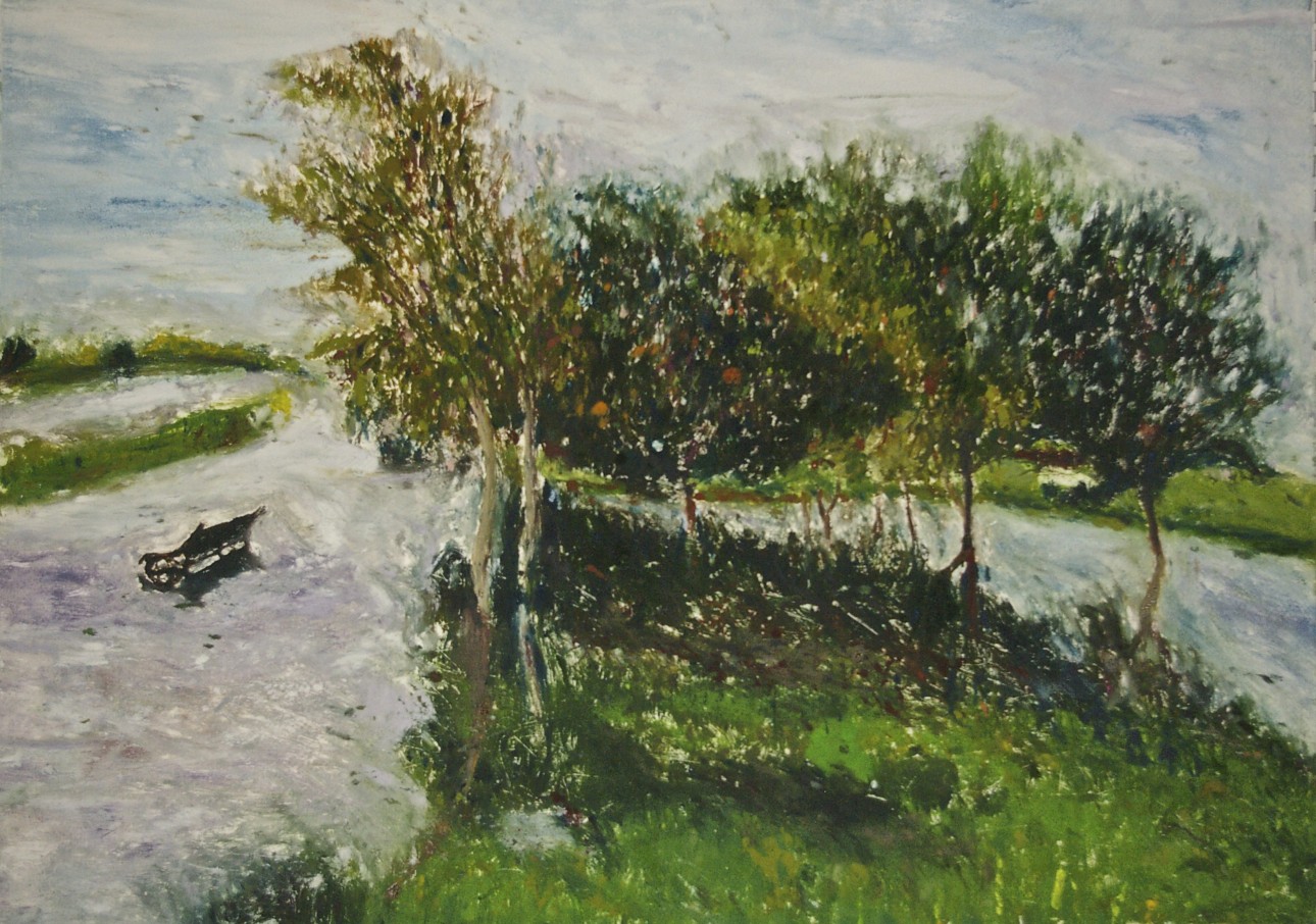 The Flight of Wild Geese at the Curve of a Road, oil on canvas, 80 x 100 cmFishstorm Over Rapeseed Field, oil on paper, 50 x 70 cmWhere the Forest Ends, a Reacuring Memory, oil on Fabriano 350 gsm paper, 50 x 69 cmAngel Pushing a bike, Apparition, oil on 350 gsm Fabriano paper, 50 x 70 cmHidden House on Catalan Mountains, oil on paper, 35 x 50Two Benches at an Approaching Flood, monotype, 49.7 x 69.6 cmBetween Showers, Curragh, monotype, 48.6 x 69.5 cmFlooded Park, monothpe, 49.5 x 69.6 cmFlooded Bench, monotype, 49.7 x 69.1 cmHot Day on the Curragh, monotype, 50 x 70 cm, (private collection)Tree by the Sea, monotype, 49.6 x 69.6 cmStormy Wind before Rain on the Curragh, monotype, 50 x 69.8 cmLone Sheep at the Curragh, monotype, 50 x 69.7 cmUnderwater Parallel, oil and pebbles on canvas, 59 x 84 cm, (private collection)Spirit Walking Towards Light, oil and gold leaf on canvas, 40 x 50 cm, 2011 – 2018Crazed Birds on a Stormy Shore, oil on canvas, 23 x 30.5 cmLevitation Over where Sea Touches Land, oil on board, 14.5 x 42 cmMood 21, oil on textured paper, 45 x 42 cmMood 22, oil on paper, 50 x 40.5Mood 23, oil on paper, 55 x 55 cmMood 6, ink on Fabriano paper, 15 x 10 cmMood 10, ink on Fabriano paper, 15 x 10 cmMood 12, ink on Fabriano paper, 15 x 10 cm